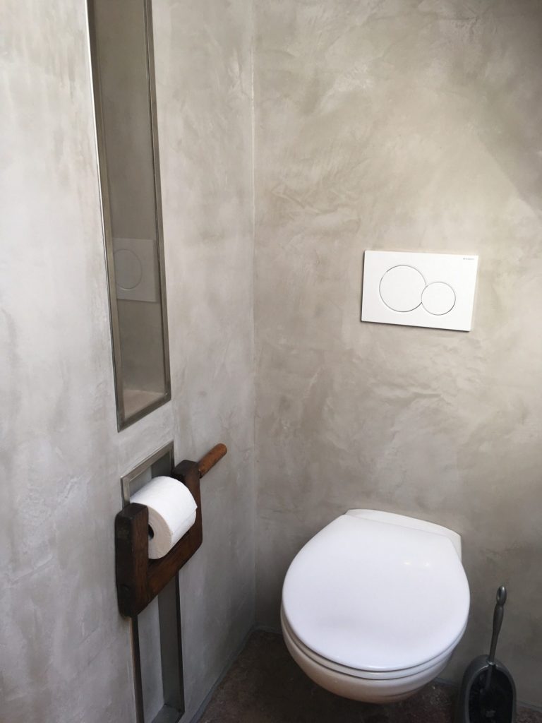 Die Spachteltechniken harmonieren hervorragend mit gefassten Möbeln und Einbauten. Die Wand hat nicht nur eine homogene Farbe, sondern ist durch den immer individuellen Spachtelschlag unterschiedlich intensiv. Ich bevorzuge die Kalkspachteltechniken (Marmorino, stucco lustro, Tadelakt) und feine Lehmoberflächen (yosima), da diese diffusionsoffen und Antifungizid sind. In Bädern harmoniert ein Marmorino an den Wänden hervorragend mit einem Beton ciré in der Dusche und dem Boden. Der Mamorino schafft ein perfektes Klima in einem Bad, welches niemals muffig riechen wird. Der Beton ciré ist ein Mikrozement, der von mir in einer ruhigen Optik verarbeitet wird. Ein 2K-PU-Lack verschafft der Oberfläche ihre Wasserfestigkeit.