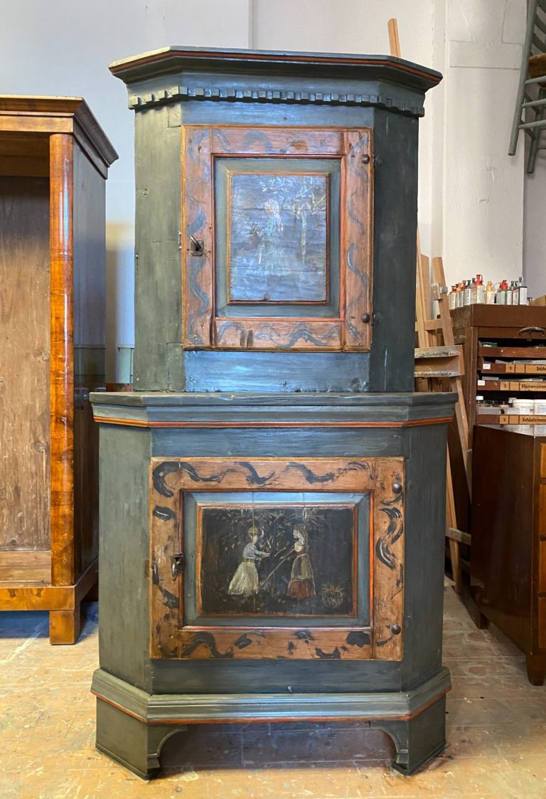 Bei antiken Möbeln benutze ich Farben die ich nach alten Rezepten aus Standöl, Kasein, Pigmenten, Kreide und Leim herstelle. Die Farben werden deckend oder lasierend aufgetragen, stets mit Zwischenschliff und anschließend patiniert. Auf Wunsch können auch Teile des Möbels mit Blattgold vergoldet werden.
